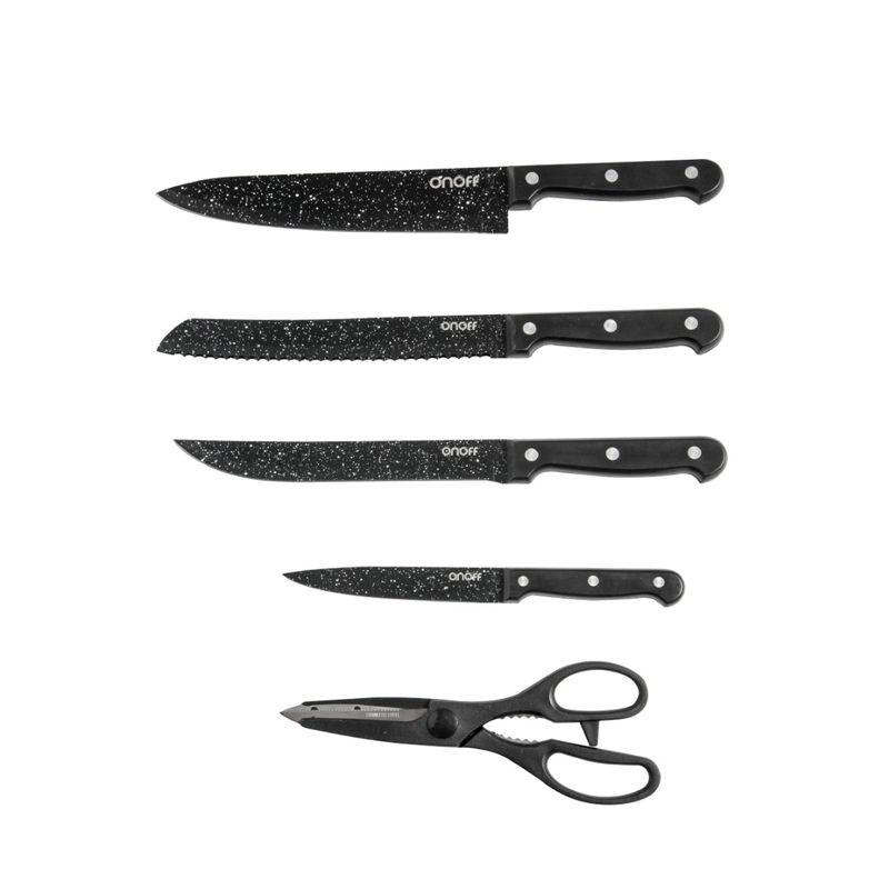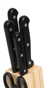 Este completo set de cuchillos + tijeras está diseñado para cubrir todas tus necesidades de corte, desde frutas delicadas hasta carnes y panes. Su diseño ergonómico, práctico y duradero hará que preparar tus alimentos sea más fácil, rápido y seguro. Contenido del set: Cuchillo de Cocina – 32,3?cm Cuchillo de Sierra (ideal para pan) – 32,2 cm Cuchillo de Trinchar – 31 cm Cuchillo para Frutas – 22,2?cm Tijeras Multiusos – 21?cm Especificaciones técnicas: Cantidad total: 4 cuchillos + 1 tijera Espesor de los cuchillos: 1.8?mm Material de las hojas: Lámina de acero inoxidable Organización: Base de madera incluida para almacenarlos de forma segura y ordenada
